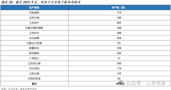 2023 年中材叶片收购中复连众100%股权,截至2023年末,公司拥有江苏阜宁、江西萍乡、江苏连云港等13个国内生产基地及1个位于巴西的国外生产基地,产能4630套、同比增加1462套(主因系收购中复连众),产能规模全球第一。