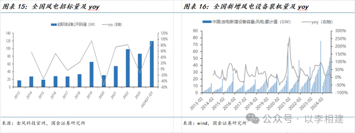 → 2025年有望复刻“抢装潮”,期待前期招标量落地。根据金风科技官网数据,24Q1-Q3全国风电设备公开招标量119.1GW、同比+93%,招标量同比高增。2022-2023年全国风电设备公开招标量分别为98.5、86.3W,而对应全国新增风电设备装机量分别为37.6、75.7GW,前期招标量未充分传导至新增装机量,主因系新能源消纳等问题。2025年为“十四五”规划最后一年,有望复刻2015、2020年“抢装潮”。