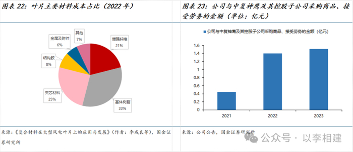 → 增强纤维为风电叶片主要原材料,占风电叶片材料成本21%,目前碳纤维在风电叶片上应用仍受限于成本,主要增强纤维使用风电纱(玻纤),由于风电纱生产门槛相对较高,目前产能主要集中在中国巨石、泰山玻纤和重庆国际三大玻纤企业,泰山玻纤与中材叶片同属于中材科技上市公司体内,同时中国巨石与中材科技控股股东均为中国建材集团,因此中材叶片供应链稳定性强,同时泰玻可继续开发高模量玻纤产品、推动产品成本相对优势;