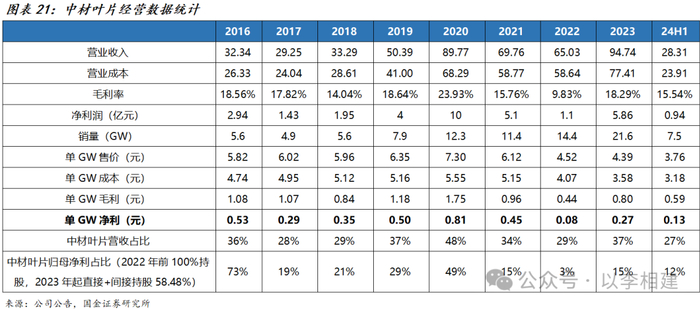 2022年以来风电行业市场竞争环境较为激烈,产品价格呈明显下行趋势,2022年及24H1公司风电叶片利润率相对较薄。收入及利润占比角度,2023年中材叶片营收占上市公司比重为27%、归母净利占比15%(中材叶片收购中复连众后,直接+间接持股比例从100%降低至58.48%),24H1中材叶片营收占比27%、归母净利占比12%。