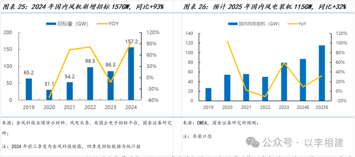 招标量指引高需求,2025年风电需求高景气。根据金风科技业绩演示材料及我们不完全统计,2024年国内新增风机招标规模约157GW,同比+93%。此外,据风芒能源统计,2024年国内各省下发风电指标超183GW,风电需求高景气趋势明确,我们预计2025年国内风电装机115GW,同比+32%。