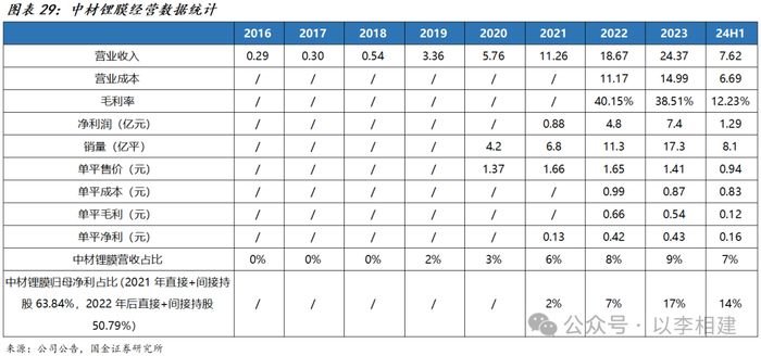 借助中国建材集团新材料平台,锂膜产能迅速扩张,销量从2020年的4.2亿平增长至2023年的17.3亿平,CAGR达60.3%。2023年公司销售锂膜17.3亿平,单平售价1.41元,单平净利0.54元。24H1公司销售锂膜8.1亿平米、同比+14%,锂膜单平售价0.94元、同比-0.48元,全行业降价背景下,公司改善产品结构,涂覆销量同比+39%、涂覆销量占比同比提升6pct,单平净利0.16元、同比-0.32元,24H1单位成本同比-3.4%。收入及利润占比角度,2023年中材锂膜营收占上市公司比重为9%、归母净利占比17%(中材锂膜直接+间接持股比例为50.79%),24H1中材锂膜营收占比7%、归母净利占比14%。