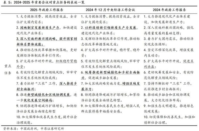 《工作报告》紧紧围绕高质量发展这一首要任务,提出了2025年关于全方位扩大内需、加快建设现代化产业体系、提升国家创新体系整体效能、更好发挥经济体制改革牵引作用等十项重点任务,其中涉及三十一项关键工作。整体来看,上述十项重点任务既是对2024年12月中央经济工作会议的细化落实,也是对上年政府重点工作任务的接续深化,尤其是其中一些略有差异的“新”表述更是进一步体现了政策对于当前重点、关键点的把握与要求。