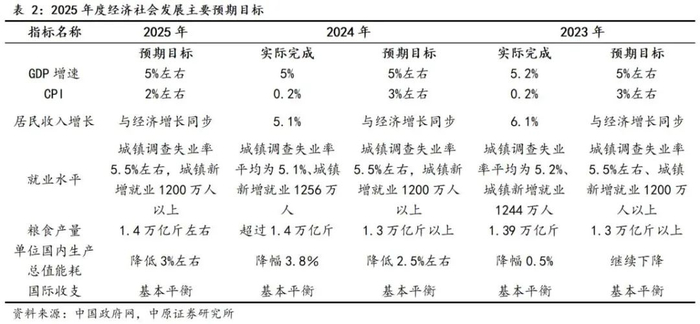 近年来,政府工作报告中的年度预期目标主要包括国内生产总值(GDP)增速、城镇就业、居民消费价格涨幅(CPI)、居民收入、国际收支、粮食产量、生态环境相关的单位GDP能耗等七个指标,与上年度相比较,2025年《工作报告》中提出的上述指标目标值中,CPI、粮食产量、单位GDP能耗等三个指标结合上年实际完成情况,分别调降、调升、调升了年度预期目标值,而其余四个指标的预期目标均与上年持平。其中:(1)上年的居民消费价格(CPI)全年涨幅为0.2%、月度CPI基本维持在0.1-1.0%区间,2025年CPI预期目标由3%调降至2%;(2)GDP增速预期目标5%,维持了自2023年以来的预期目标,与市场预期一致,其中包含了稳就业防风险惠民生以及与中长期发展目标相衔接的综合考量。简言之,2025年预期目标兼顾了需要与可能,也突出了务求实效、迎难而上的鲜明导向。