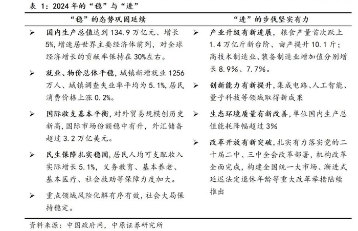 2025年3月5日,第十四届全国人民代表大会第三次会议在北京召开,会议期间审议了《2025年政府工作报告》(以下简称“《工作报告》”)。《工作报告》首先以翔实数据从宏观调控成效、改革开放推进、创新驱动发展、统筹城乡区域协调发展、民生福祉增进、生态环境保护、政府治理建设等七方面,总结了2024年我国经济社会“稳中有进”的发展成效(参见表1);其次,客观研判当前面临的国际、国内形势,明确提出:外部环境尤其是关税壁垒增多、地缘政治紧张因素依然较多,可能对我国贸易、科技等领域和投资者信心等方面带来更大冲击;内部则存在有效需求不足尤其是消费不振、部分企业生产经营困难、账款拖欠问题突出、群众就业增收压力大、一些地方基层财政困难、政府效能和依法行政能力有待提升等制约经济社会发展的突出问题;最后,提出2025年经济社会发展目标要求及与之配套的政策思路、重点工作。