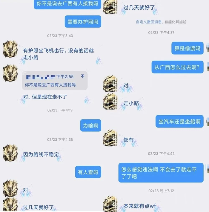 该网友提出添加QQ号,聊天中称如有护照,可乘飞机前往;没有则可“走小路”,但他解释由于近期严查,“现在走不了,线路不稳定”“过几天就好了”。记者询问所谓“走小路”是偷渡吗?对方回答“对”。而当记者表示这属于违法行为时,该网友则回复“本来就有点wf(违法)”。