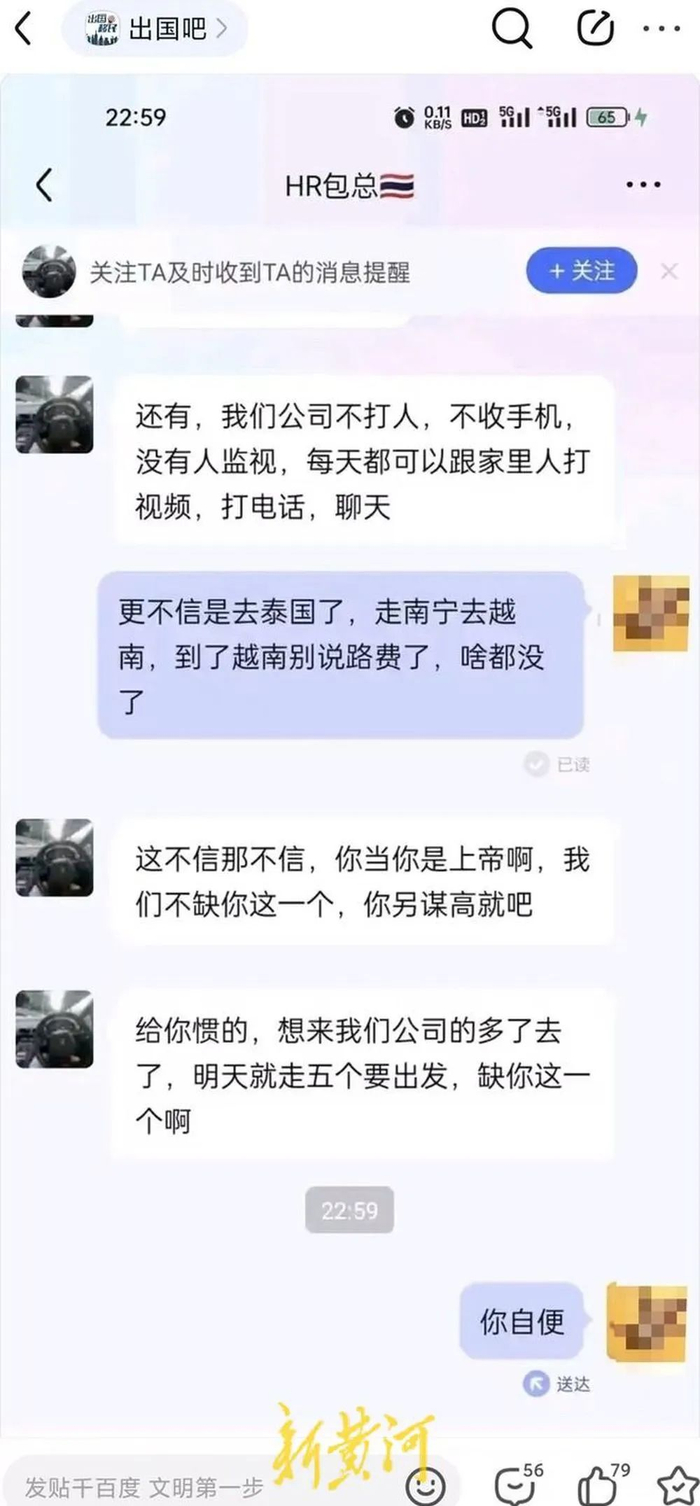 还有网友发帖晒出私信对话,提醒其他人谨防上当受骗。网友“猛男少女心”发布的跟“HR包总”的聊天截图显示,“HR包总”称“到了就给你报销(路费)”“走小路,路费我们出”“我们公司不打人,不收手机,没有人监视,每天都可以跟家里人视频、打电话……”“猛男少女心”回复说:“走南宁去越南,到了越南别说路费了,啥都没了。”“HR包总”则直接说:“给你惯的,想来我们公司的多了去了,明天就走五个要出发,缺你这一个啊……”