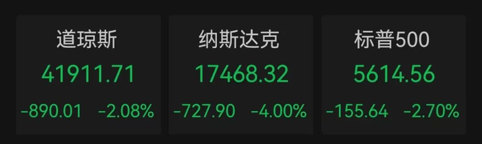 大型科技股普跌,英伟达跌超5%,苹果、Meta、谷歌跌超4%,微软跌超3%。