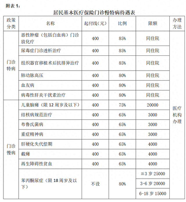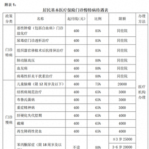 门诊特病6种,门诊慢性病8种,起付线均为400元,报销比例和年度限额分别按病种设定(详见附表1)。