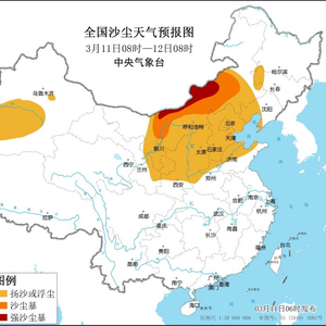 预计,3月11日08时至12日08时,新疆南部、内蒙古中西部、甘肃东部、宁夏、陕西中北部、山西、河北、北京、天津、河南北部、山东北部、辽宁西部、吉林西部等地有扬沙或浮尘天气,其中内蒙古中西部的部分地区有沙尘暴,局地有强沙尘暴(见图1)。中央气象台3月11日06时发布沙尘暴黄色预警。