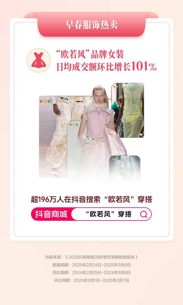 在抖音,“用欧若风打开春天”“打工人的欧若风”“欧若风新中式”等内容频频登上热榜,平台也借此携手一众服饰品牌,为爱美女性推出“欧若风”专属货盘。报告显示,大促期间,“欧若风”品牌女装日均成交额环比增长101%,超196万人在抖音搜索“欧若风”穿搭。
