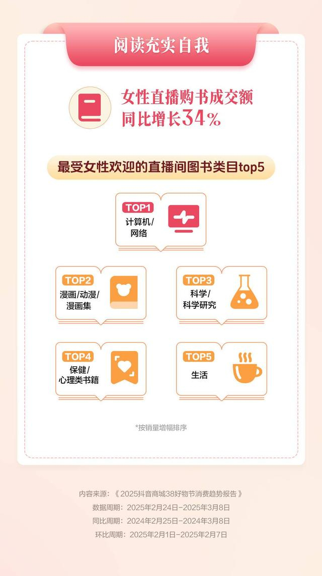 除了“外在美”,女性对“内在美”的追求也同样呈现新增长。报告显示,女性直播购书成交额同比增长34%,计算机、漫画、科学、保健/心理、生活类书籍是直播间里的最受女性欢迎的类目。