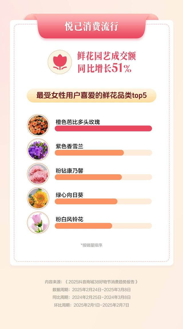 3月11日,2025“抖音商城38好物节”消费数据报告发布,呈现平台全域经营情况和消费者购买偏好。数据显示,2月24日至3月8日,抖音商城日均成交额同比增长62%,订单量同比增长48%。女装、珠宝文玩、美妆个护、鲜花等品类最受消费者青睐。