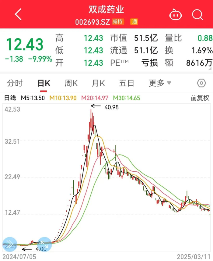 在创下历史高点之后,双成药业股价一路震荡走低。据证券时报·数据宝统计,截至3月10日收盘,该股收盘价较历史高点回撤幅度达到66.3%。
