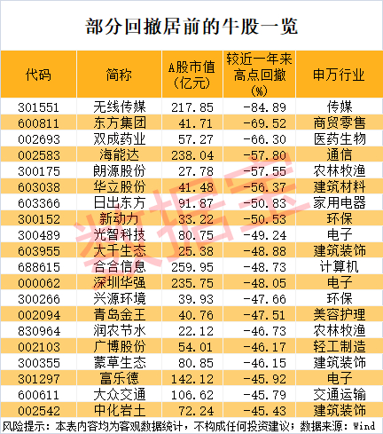 不少牛股在热炒后迅速降温,股价出现大幅回撤。3月10日收盘价与近一年来高点相比,上述3倍大牛股中,回撤幅度超40%的有52只。8股回撤幅度超50%,分别是无线传媒、东方集团、双成药业、海能达、朗源股份、华立股份、日出东方、新动力。