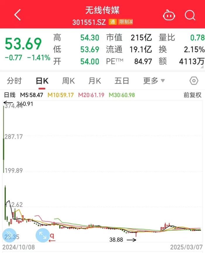 次新股无线传媒回撤幅度最大,该股于2024年10月登陆创业板,上市后第4天股价触及360.9元/股(前复权)的历史高点,跻身至A股第七高价股。3月10日该股收盘价在55元/股附近,相比历史高点回撤84.89%。