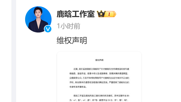 2月25日下午, @鹿晗工作室 发布“告黑声明”,文中提及:“鹿晗先生已经为自己的不当行为承担了作为公众人物应该承担的责任,我们相信法律也会让造谣者、传谣者以及恶意中伤者承担他们应该承担的责任。”