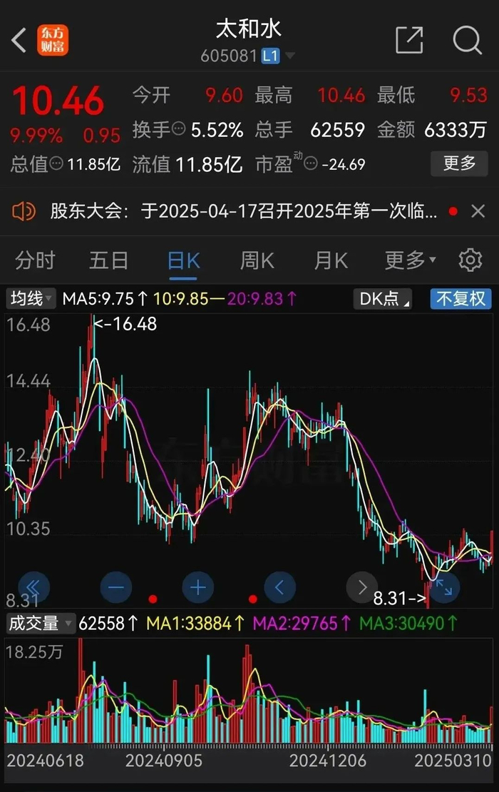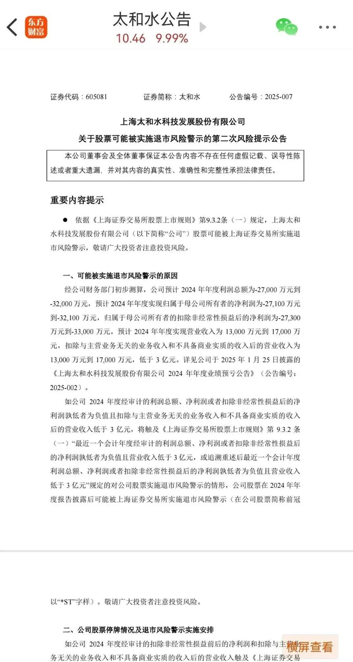 太和水业绩不佳,一方面是因为所处行业竞争激烈,市场需求变化;另一方面,公司内部管理问题也逐渐显现,管理与运营模式的调整未能及时适应市场变化,导致固定成本上升,效率下降。此外,公司在 2024 年尝试跨界 AI 算力,但超 3 亿元的算力大单未能在营业收入中如数体现,跨界成效不佳。若 2024 年年度报告披露后,公司财务数据触及相关规定,股票可能被实施退市风险警示,这将对公司的声誉和投资者信心造成极大的打击。