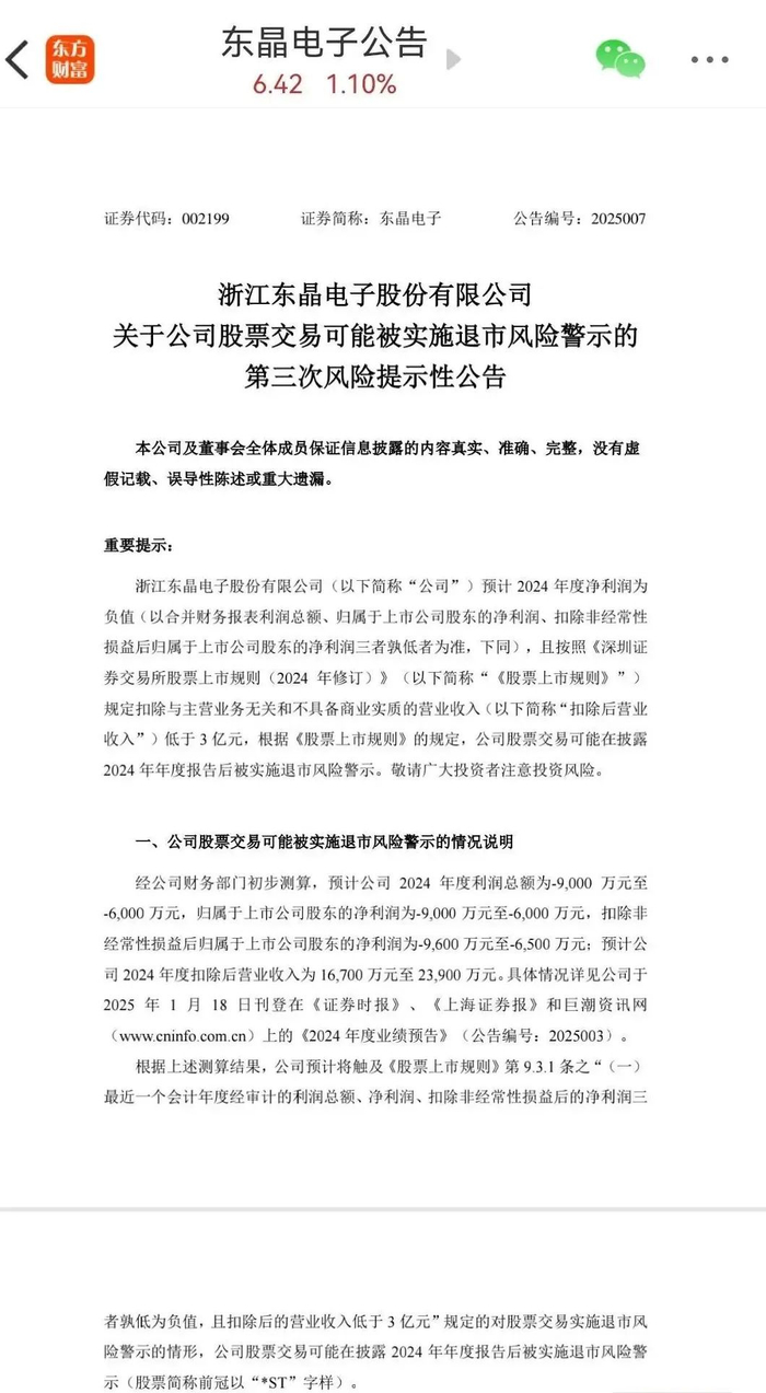 这一系列因素使得公司股票交易可能在披露 2024 年年度报告后被实施退市风险警示。一旦被实施退市风险警示,东晶电子的股价可能会进一步下跌,融资难度加大,公司的发展将面临更大的挑战。