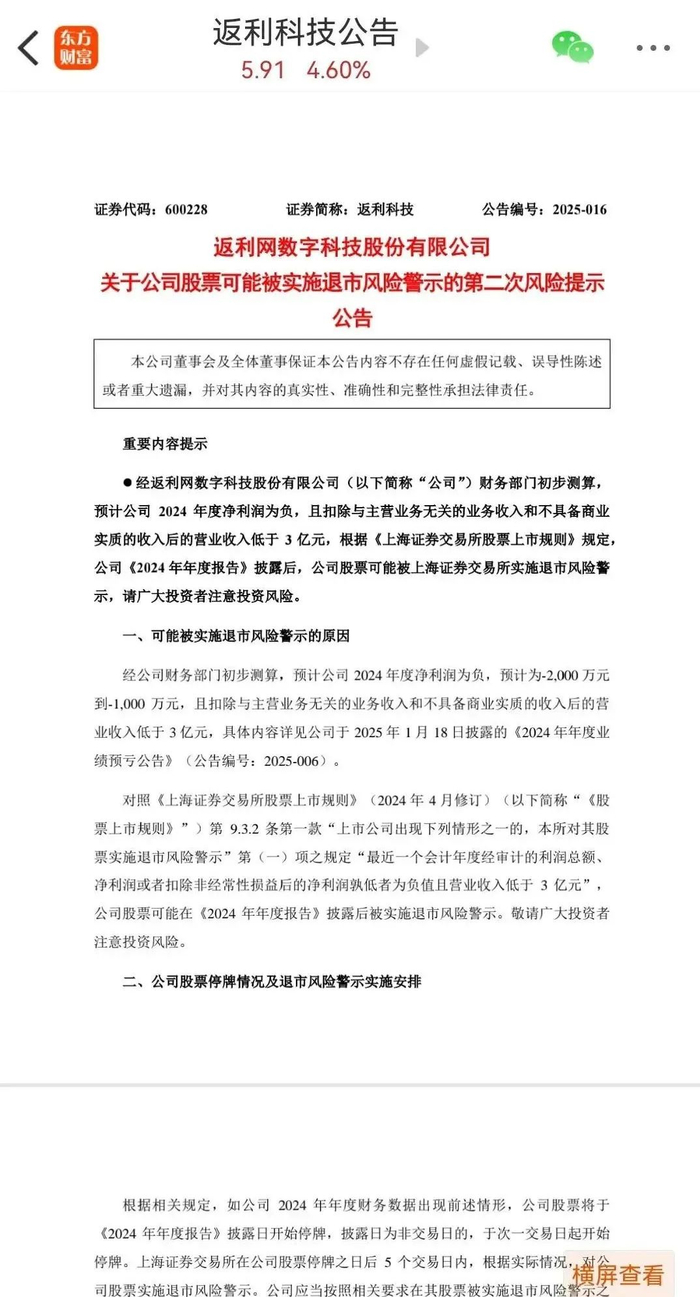 若最终审计结果确认上述数据,根据《上海证券交易所股票上市规则》第 9.3.2 条第一款的规定,返利科技将被实施退市风险警示。这不仅会使公司股票交易受到限制,日涨跌幅限制变为 5%,还可能导致股价大幅下跌,投资者信心受挫。