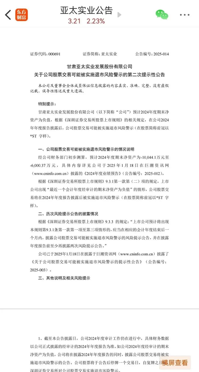亚太实业的处境也不容乐观。公司预计 2024 年度期末净资产为 - 10044.1 万元至 - 6000.37 万元,为负值。截至公告披露日,累计逾期借款共计 2.14 亿元,占 2023 年度经审计的归母净资产的 532.32% 。逾期借款不仅让公司需承担相应的逾期利息、滞纳金及罚息,还可能面临诉讼、仲裁风险,以及因处置股权而丧失主营业务的风险。