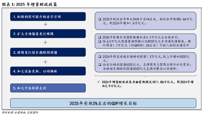 发行超长期特别国债1.3万亿元,以及结合发行5000亿元特别国债支持国有大型商业银行补充资本,使得2025年合计新增政府债务总规模11.86万亿元,较上年增加2.9万亿元,也显示出财政政策更加积极,为稳增长提供了有力保障。