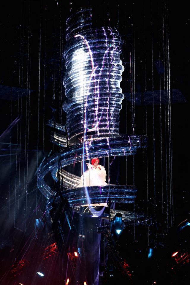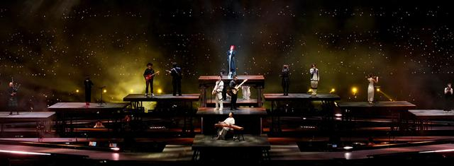 在灯光设计方面,舞台灯组与环绕体育场场周灯组以点、线、面光束交叠变化,共同勾勒出线条明朗、立体分明的星际图景。当《疯人院》的歌声响起时,光影编织出一个八角笼;《小镇里的花》前奏响起,灯光变化成中式古典纱幕,构建了写意浪漫的东方意境。在舞台技术方面,珠帘屏的启用,让画面充满空间感,灯光、四面大屏和地屏交相呼应,给观众带来了极致的视觉体验。