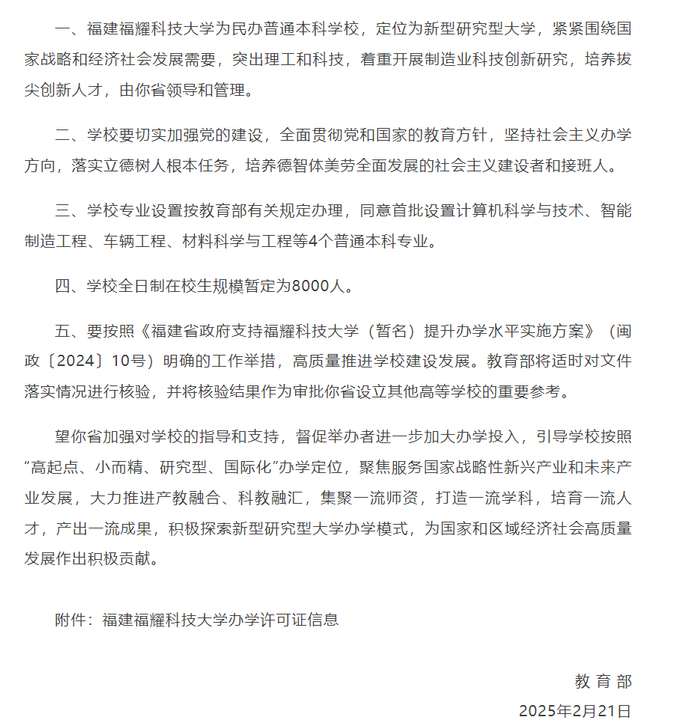 据中国福建官方微信号3月11日消息,福耀科技大学专业设置按教育部有关规定办理,同意首批设置计算机科学与技术、智能制造工程、车辆工程、材料科学与工程等4个普通本科专业。学校全日制在校生规模暂定为8000人。