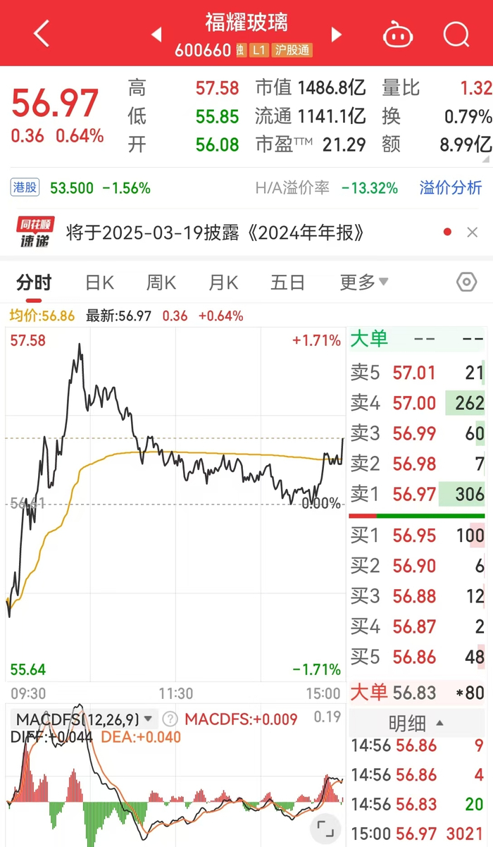 3月11日收盘,福耀玻璃A股股价报56.97元/股,总市值为1486.8亿元。