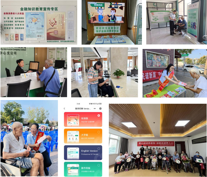 中国人寿财险河南省分公司各营业网点均按统一标准版式建设了金融知识教育宣传专区,包括统一标识、海报栏、公告栏、折页栏及八大权益文字介绍。其中,海报栏常态化展示“客户投诉指南”“金融教育在线专区”海报;公告栏固定展示“风险提示”“以案说险”“偿付能力信息披露”公示信息;折页栏展示品种丰富、数量充足的消保宣传折页,包括面向特殊人群展示的大字版普法折页、英文版和双语版八大权益折页;营业期间网点的电视机、电子屏轮播消保宣传视频和宣传口号。无论是在网点向老年客户宣传消保知识,指引线上平台操作切换“大字版”“英文版”“新市民版”,还是在金融宣传月进乡村进社区进养老院的针对性宣讲,始终以耐心细致的讲解,为特殊人群提供金融知识宣传,做好金融消费风险提示。
