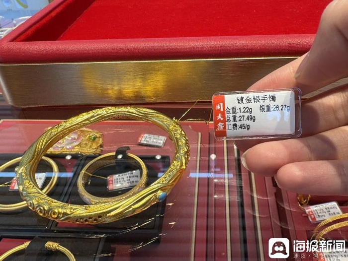 记者看到,店里的一款哪吒乾坤圈“金包银”手镯成品总价在2400元上下,重量约27克,足金1.22克左右,工费45元/克,价签上写着“镀金银手镯”。