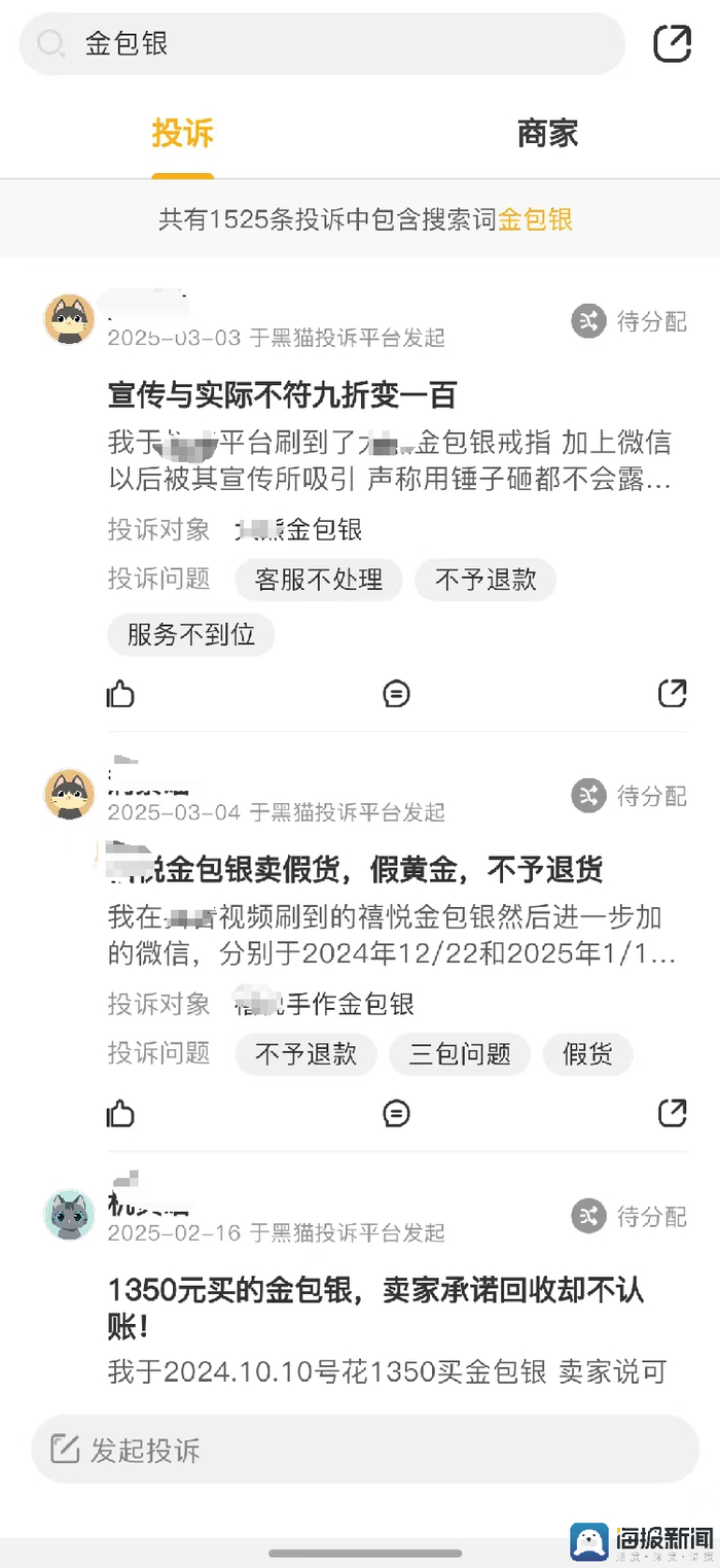 此外,记者在黑猫投诉平台上,打上“金包银”,立马弹出上千条维权信息,大多数是在线上购物平台购买金包银饰品佩戴不久后,发现有质量问题,但和商家沟通无效的投诉信息。