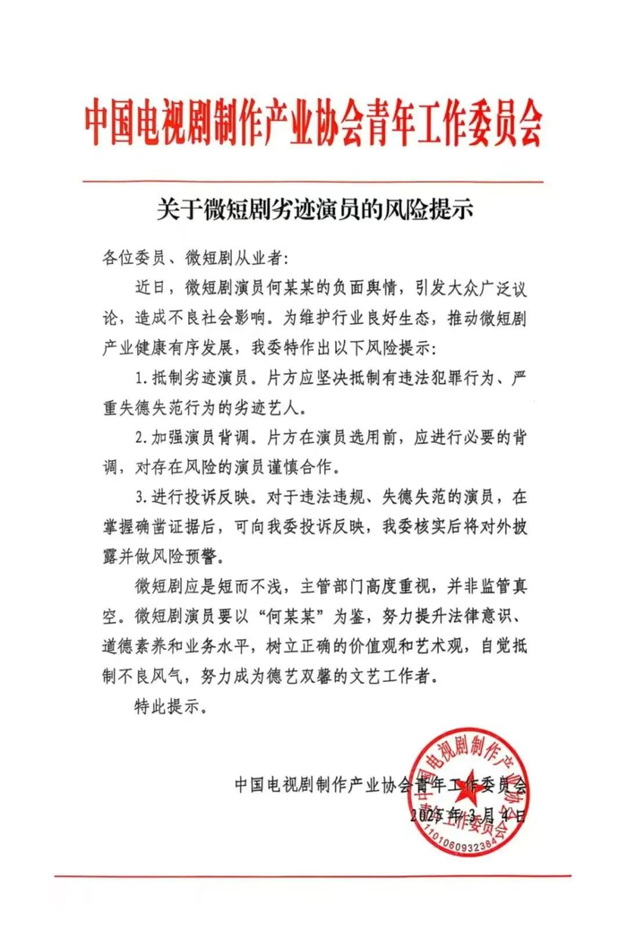 3月4日,中国电视剧制作产业协会青年工作委员会发布“关于微短剧劣迹演员的风险提示”