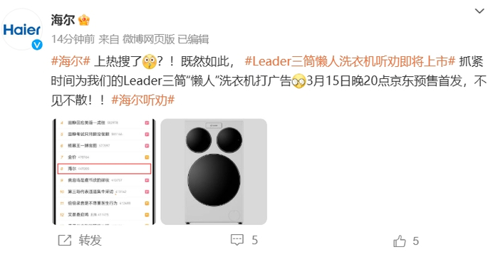 3月11日,海尔在微博宣布,Leader三筒懒人洗衣机即将上市,新品将于3月15日晚20点在京东预售首发,官方宣称“为大家解锁三筒快净0手洗‘懒人新纪元’”。