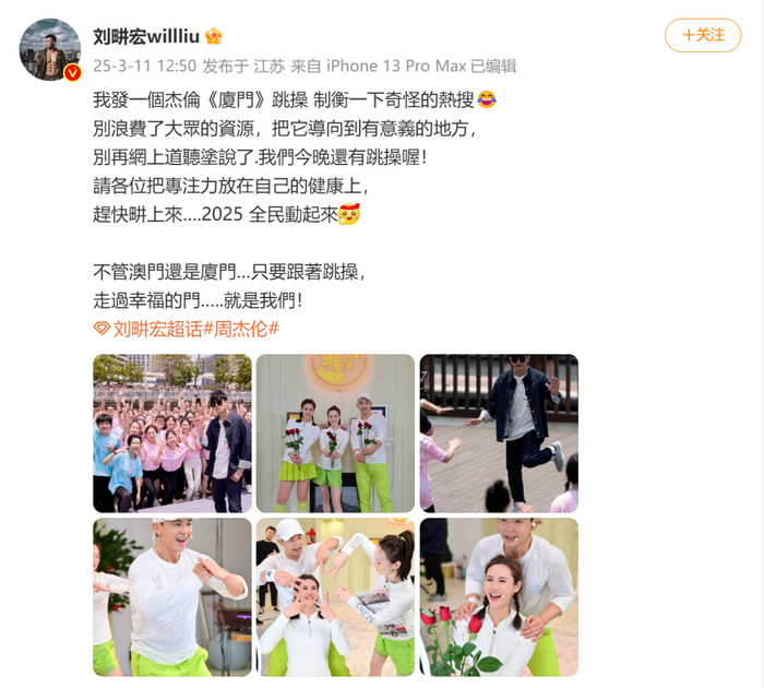 3月11日,刘畊宏在微博发文,晒出了周杰伦厦门跳操的图片,配文“我发一个杰伦《厦门》跳操 制衡一下奇怪的热搜”。并呼吁大家“别再网上道听途说了,我们今晚还有跳操!请各位把专注力放在自己的健康上,全民动起来!”