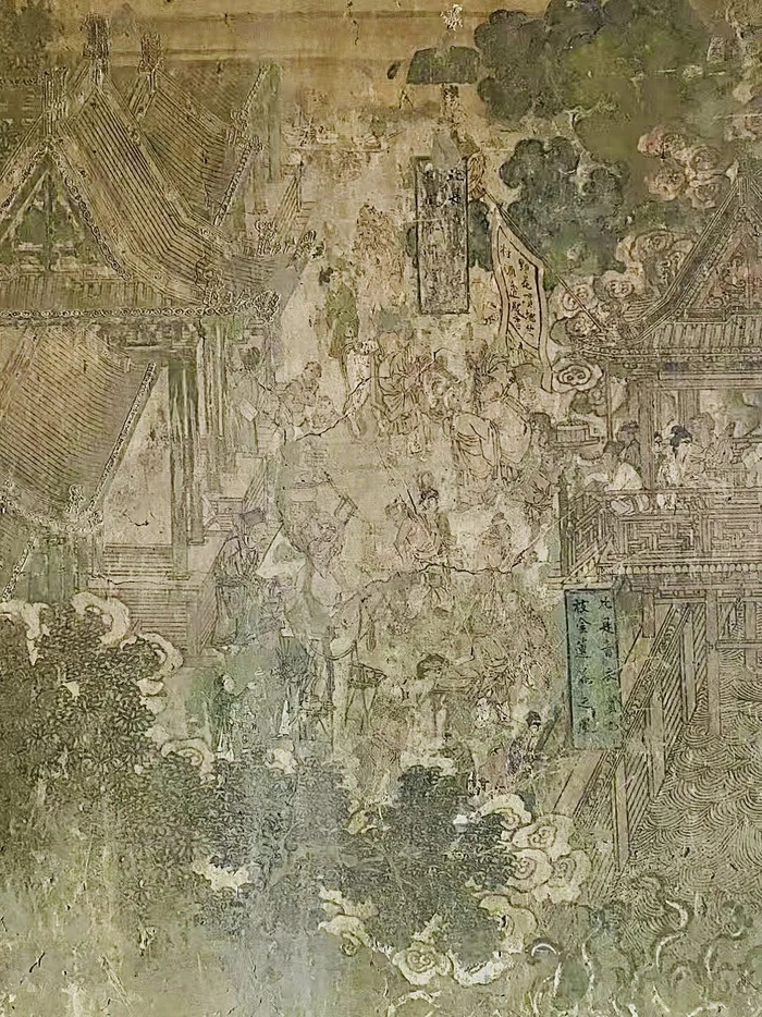 而谈及“壁画上的清明上河图”,就不得不提到“卧龙凤雏”中的另一个——高平开化寺。开化寺壁画被奉为北宋正统,但乃属于当地民间画匠所为,内容多为经变故事,虽然也表现了相当的世俗画意向、描绘了市井百态,但总体更偏向于人物刻画,不似岩山寺壁画那般对宋金官、民建筑进行了不遗余力的海量“复刻”。虽然壁画面积高达88平米,但整体现存状态较为脆弱,故出于文保需要,今天开化寺大殿门前铁栏紧闭,使得我们无缘踏足其中,一睹这座第五批国保的风采了。