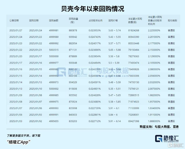 据悉,2024年全年,贝壳共斥资约7.16亿美元回购股票,回购股数约占2023年末已发行总股本的3.89%。而今年以来,公司在1月份回购数超1300万股,涉及资金约7500万美元。贝壳的股票回购采取“注销方式”,实实在在直接增厚投资者收益。