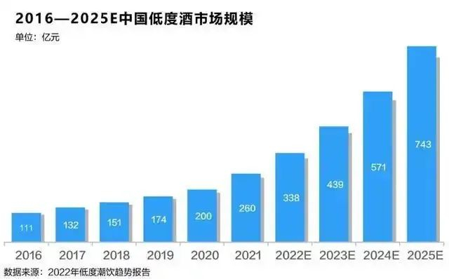 据TMIC&凯度发布的2022年低度潮饮趋势报告显示,2022年,我国低度潮饮酒市场规模达到338亿元,预计2025年市场规模预计超700亿元,年复合增长率为30%左右。