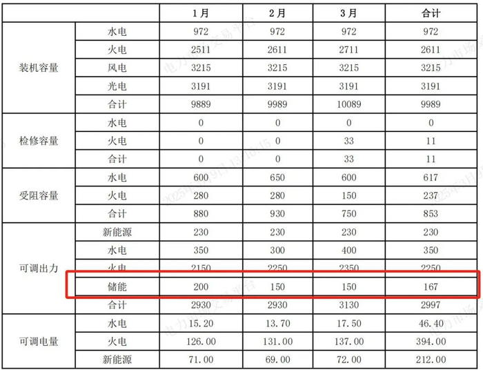 从电力平衡角度看,按风电发电置信度90%(约230万千瓦),1-2月晚峰时段省内电力保障能力不足,略有缺口。午间及风电大发时段富裕电力较多,其中可调出力中,储能1-3月合计167万千瓦。详见下表: