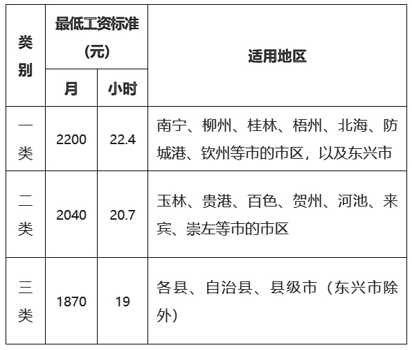 一类地区最低工资标准拟调整至2200元/月,适用地区包括南宁、柳州、桂林等市的市区,以及东兴市;