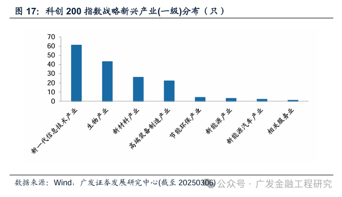 战略新兴产业一级分布方面,科创200指数成分主要集中于新一代信息技术产业、生物产业、新材料产业。根据Wind,截至20250306,科创200指数在新一代信息技术产业、生物产业、新材料产业方面配置的股票数量分别为61只、43只、26只。