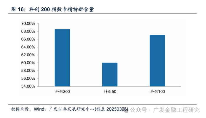 从专精特新含量来看,科创200指数成分股数量占比相对其他科创规模指数占优。截至20250306,根据Wind,科创200指数成分股内归属专精特新企业的数量占比约68.5%,高于科创50与科创100指数成分股归属于专精特新企业、专精特新小巨人企业数量占比。