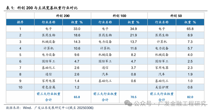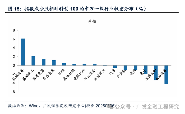 申万一级行业分布上,根据Wind,截至20250306,与科创50指数相比,科创200指数主要超配机械设备(10%)、医药生物(10%)、电力设备(4%)、计算机(3%)、通信(3%)等,低配集中在电子行业(33%);与科创100相比,科创200指数主要超配的行业有机械设备(6%)、基础化工(2%),主要低配的行业有电力设备(4%)、医药生物(3%)、电子(2%)。