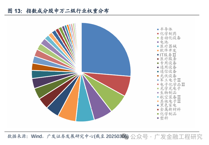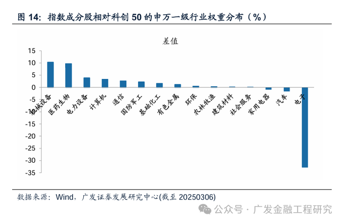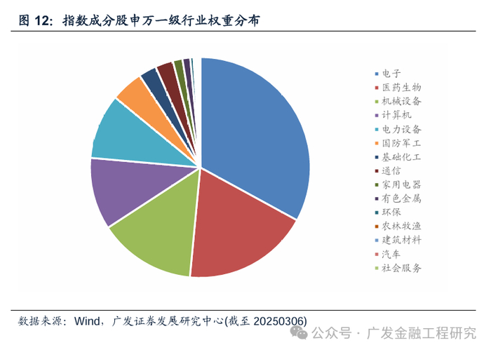成分股特征:前十大成分股相对分散,硬科技含量高,“专精特新”属性突出。根据Wind,截至20250306,指数总共涵盖了15个申万一级行业,前三大行业为电子(33%)、医药生物(19%)、机械设备(14%),前十大成分股权重和约15%。成分股内归属专精特新企业的数量占比约68.5%,高于科创50与科创100。