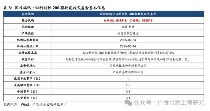 国投瑞银上证科创板200指数基金(A份额:023518;C份额:023519)是追踪上证科创板200指数的指数基金产品。该产品由国投瑞银基金发行,旨在紧密跟踪标的指数表现,追求跟踪偏离度和跟踪误差的最小化。根据Wind,该产品于2025年2月24日至2025年3月14日期间发行。另外该基金为发起式基金,基金公司跟投1000万元,持有期3年。