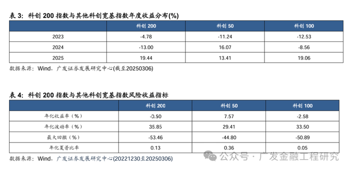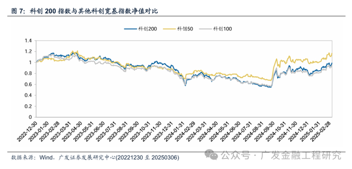与宽基指数相比,市场表现方面,截至20250306,科创200自基日以来的指数累计表现强于科创100、弱于科创50指数。累计收益方面,自20221230至20250306,与科创100指数相比,科创200指数的走势占优。分年度收益方面,截至20250306,科创200指数在今年以来跑赢科创50、科创100指数。