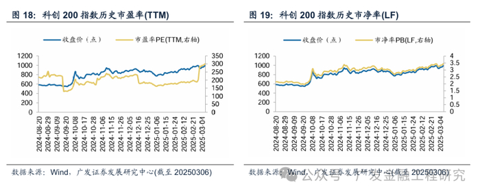 估值方面,科创200指数发布时间为2024年8月20日,历史可回溯估值时间相对较短。根据Wind,截至20250306,该指数的PE(TTM)为299.76倍, PB(LF)为3.44倍。