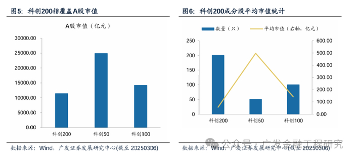 上证科创板200指数:从上海证券交易所科创板中选取市值偏小且流动性较好的200只证券作为指数样本,与科创50、科创100指数共同构成上证科创板规模指数系列。科创200指数成分股内小市值股票相对集中,Wind数据显示,截至20250306,科创200指数成分股中所有成分股自由流通市值均值约36.18亿元,