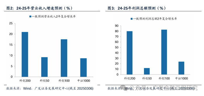 弹性要远大于其他指数的原因,可能在于成长能力方面,科创200指数在2024年、2025年一致预期营收增速高于其他指数。科创200指数营业收入2年复合增速(24E~25E)为20.9%,而科创50、科创100、中证1000的增幅分别为9.1%、17.5%、8.6%;科创200指数营收增速(24~25E)为81.5%。