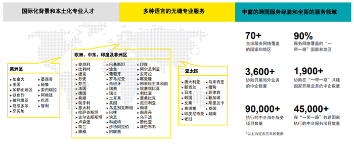 目前,安永中国海外投资业务部(COIN)覆盖了全球90%以上的国家与地区,过去三年协助了超过3600家中国企业开展海外业务,为中国企业“走出去”提供一站式服务。
